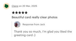 Each photo card is carefully handmade using high-quality materials and beautifully captured images. Every card is designed to feel personal, meaningful, and truly special. I’ve received amazing feedback from customers who love the clarity, detail and uniqueness of these photo designs.